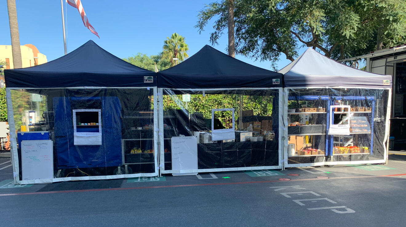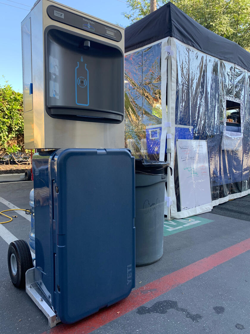 Built from antimicrobial plastic and stainless steel, our Touchless Water Stations allow cast and crew to refill their water bottles without physical contact and without using costly bottled water. A hand sanitizer dispenser is attached for extra cleanliness. Portable for quick location changes and compact so there's always water nearby when you need it.Tented Display Carts